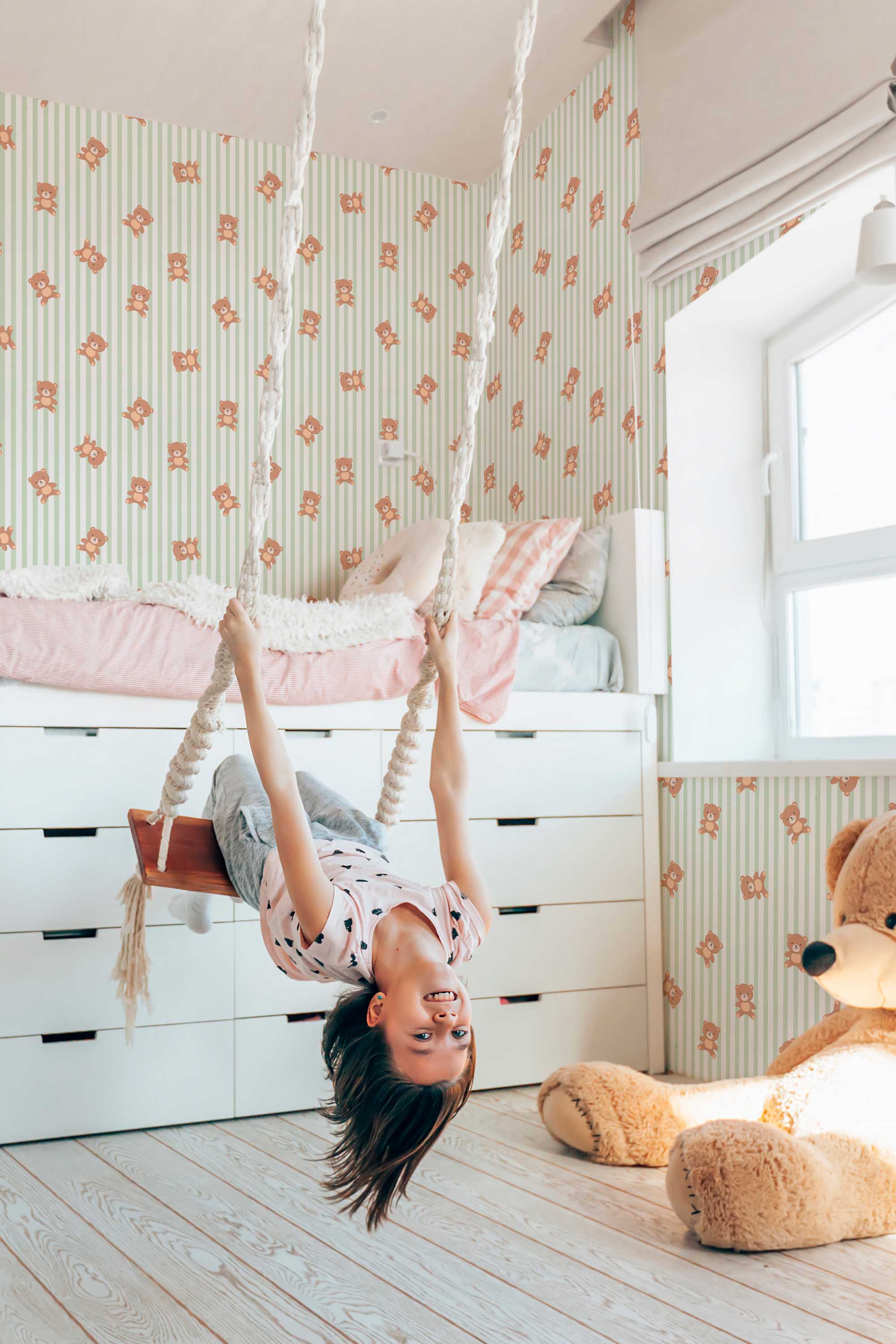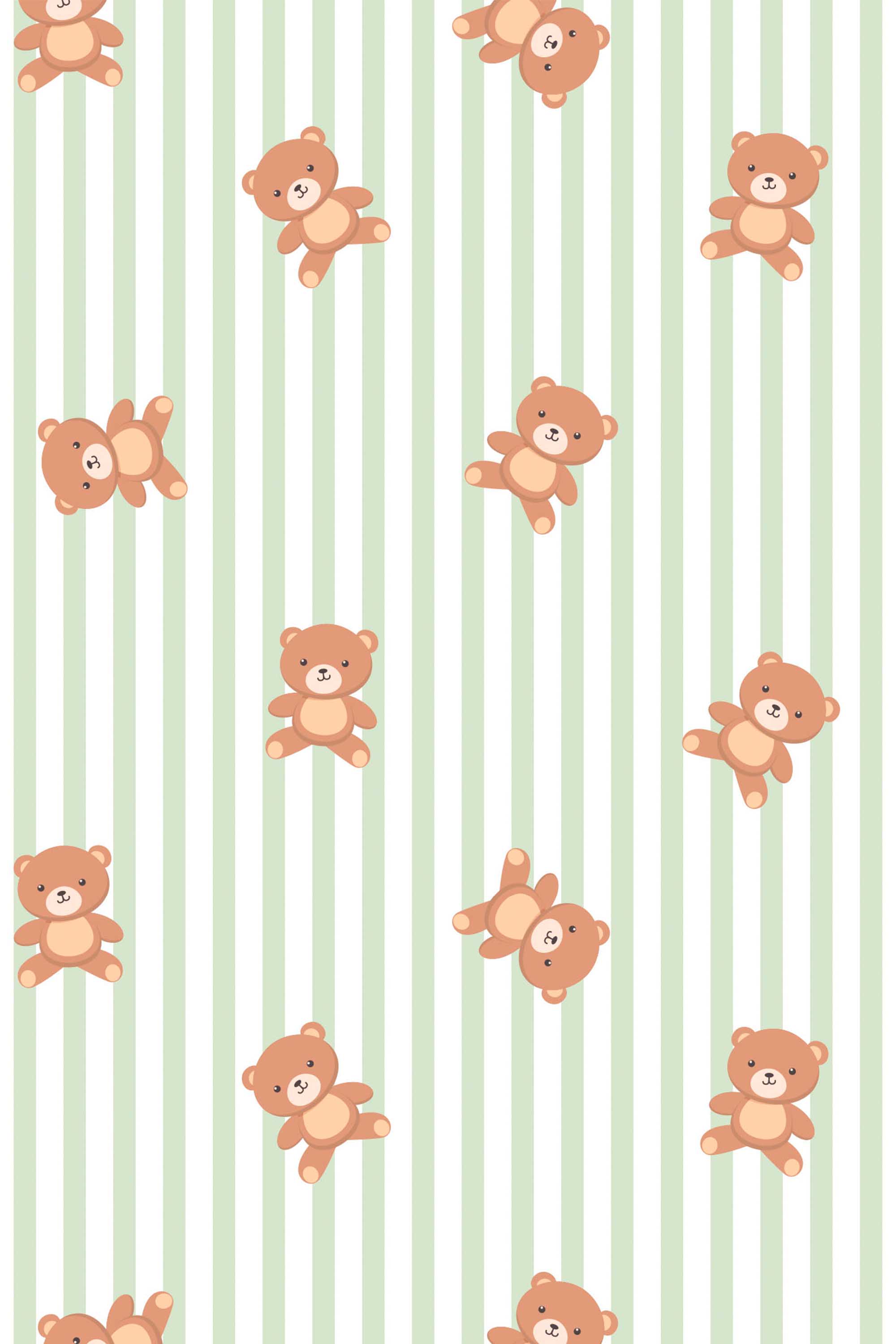 Teddy Bear Striped Wallpaper brings soft boho charm to your nursery with gentle beige stripes, a calming sage palette, and adorable teddy bear accents. The warm tones create a cozy, neutral atmosphere that feels sweet and timeless for little ones. Its simple details add personality without overwhelming the space, making it ideal for calm, playful nursery moments.