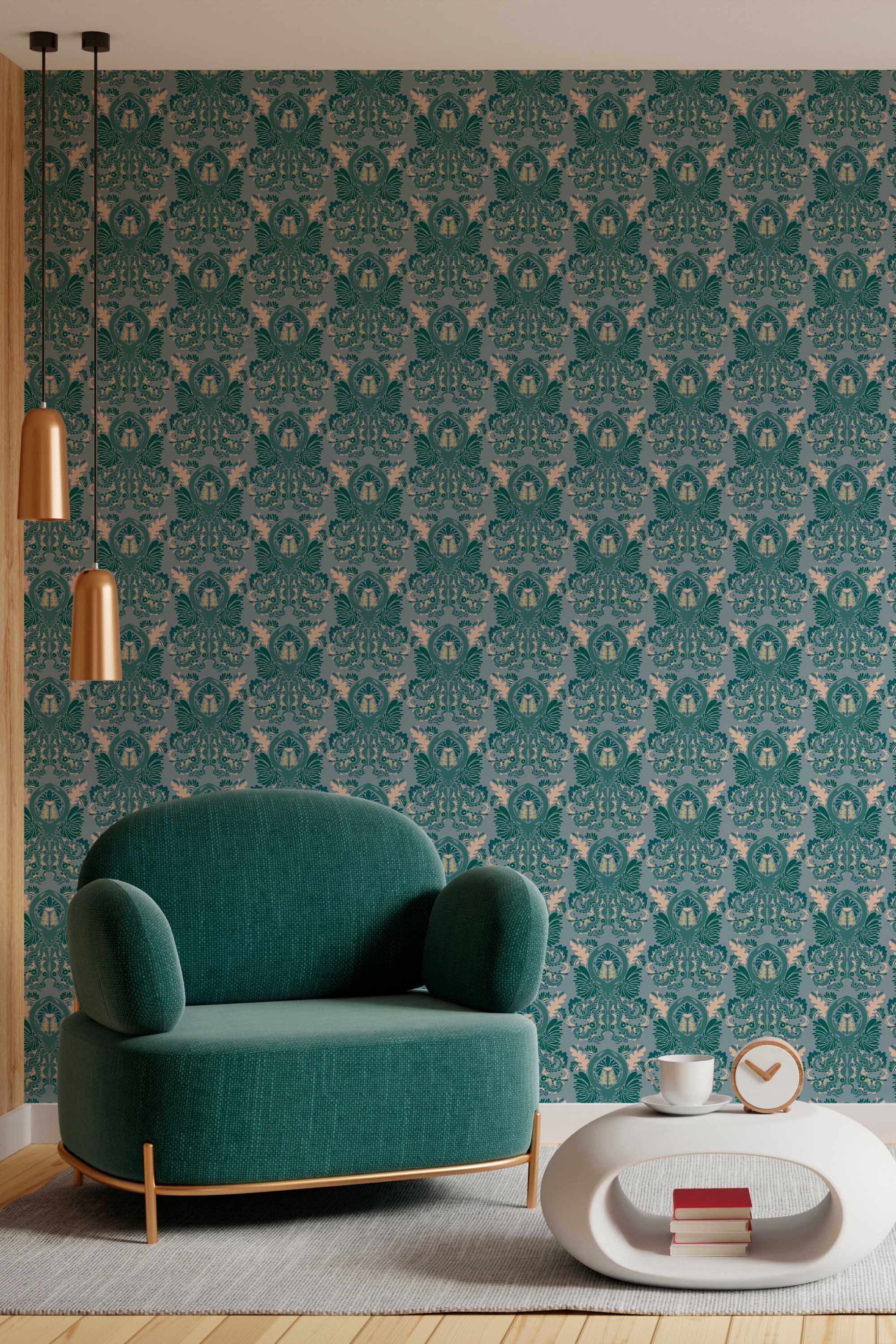 Victorian Octopus Wallpaper brings bold, dramatic character to living rooms with its deep green palette and gothic nautical mood. Ornate scrollwork surrounds striking octopus motifs, forming a rich damask repeat that feels historic, daring, and decorative. Moreover, the intricate layout adds depth and mystery while creating a strong focal wall. The design pairs beautifully with dark woods, brass accents, and layered vintage décor, giving the space a confident, curated atmosphere.