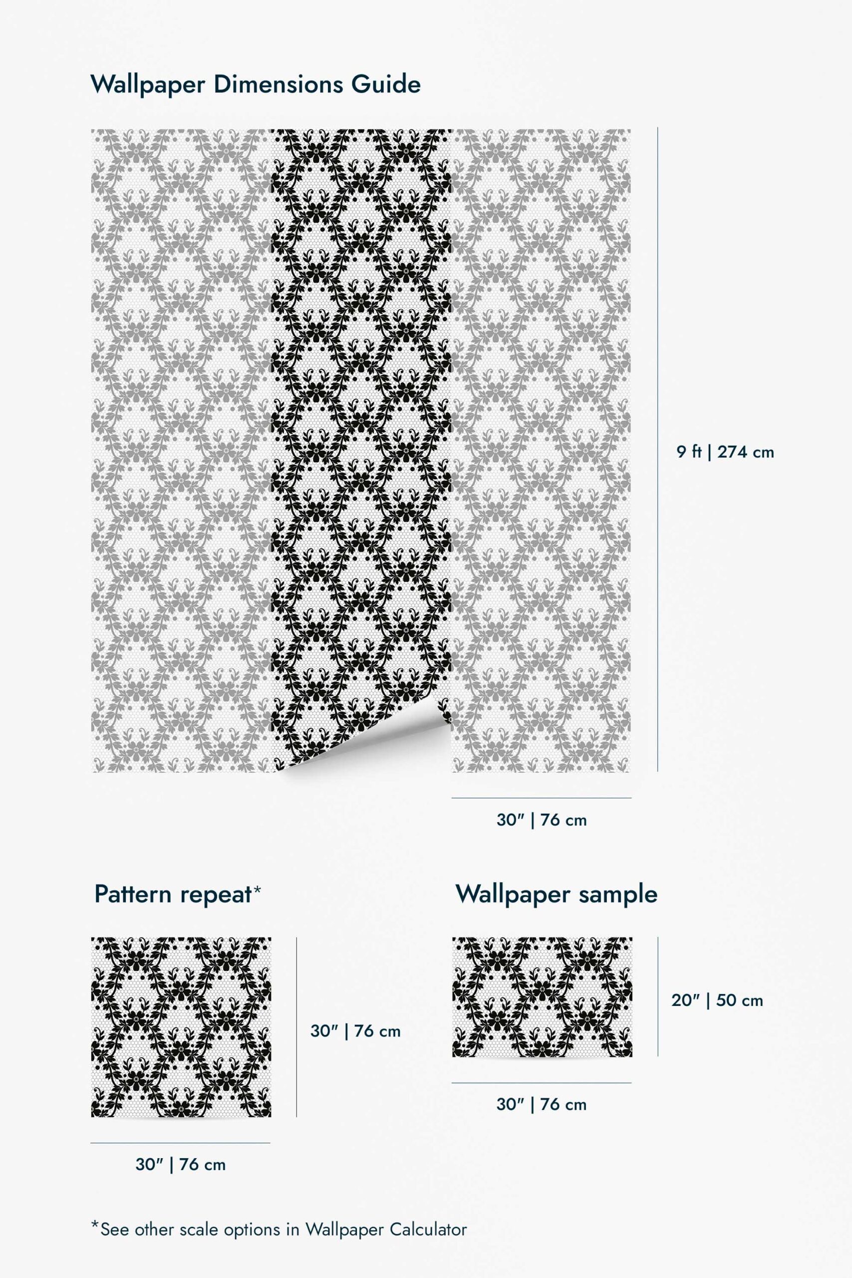 Vintage Floral Laces wallpaper adds a touch of gothic elegance to your living room with its striking black-and-white palette. This exquisite design features a captivating black gothic lace pattern interwoven with floral and leaf motifs, arranged in a sophisticated damask-style structure over a honeycomb mesh background. Perfect for transforming any room into a romantic noir haven, Vintage Floral Laces wallpaper is also available in a range of colors, allowing the original black and white to be replaced with any of our standard shades or a custom color of your choice.