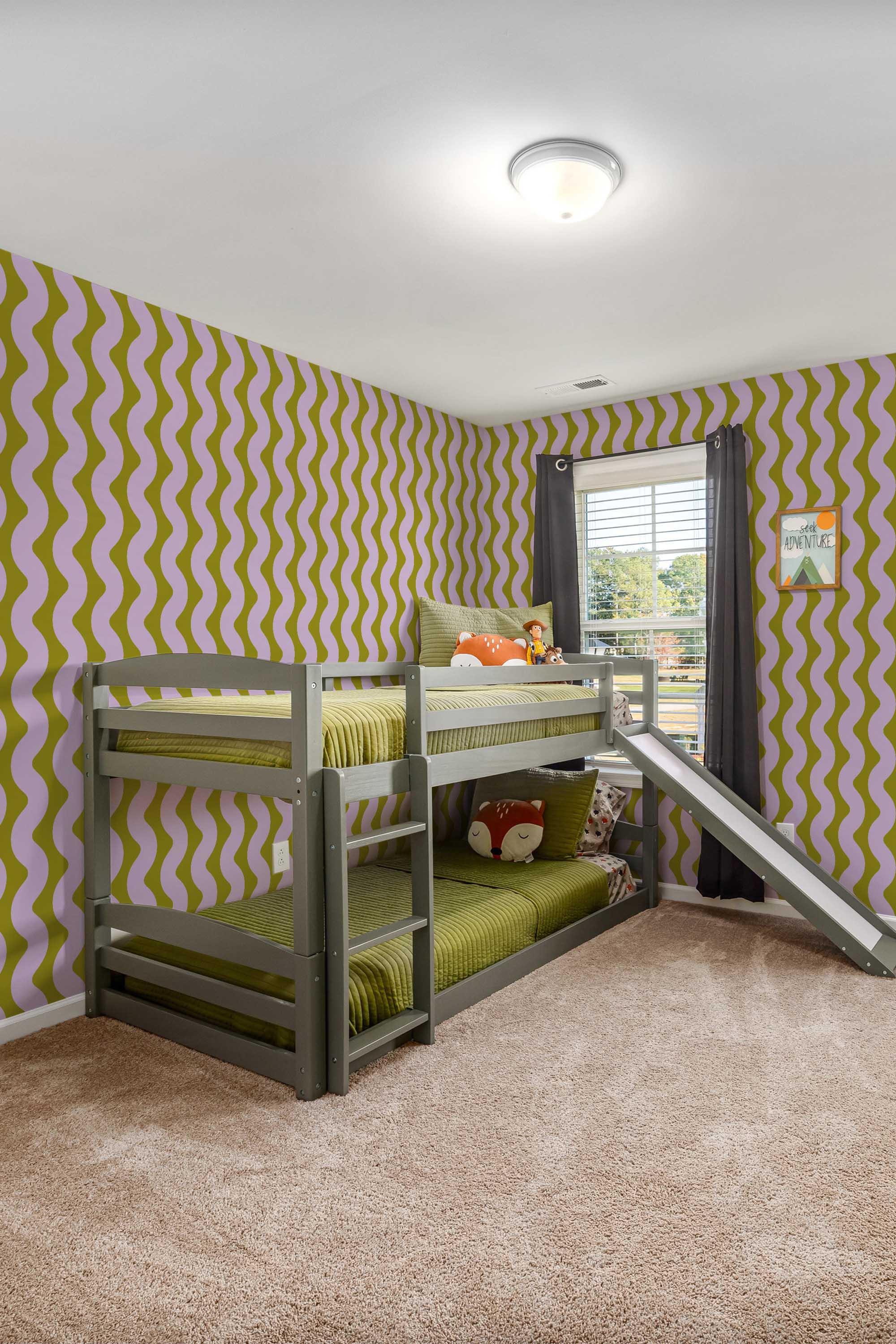 Wavy Teen Room wallpaper brings bold retro style to a teen bedroom or creative space with vibrant purple tones and flowing olive and lavender lines. The dynamic wavy pattern captures a midcentury spirit while keeping the look fresh and playful. The Wavy Teen Room peel and stick wallpaper offers a removable and self-adhesive option for easy room updates, and it is also available as non-pasted for traditional paste-the-wall installation. Teen Room Waves blends abstract curves with colorful energy, making it perfect for statement walls. Printed on eco-friendly, PVC-free materials using GreenGuard Certified inks, this wallpaper is safe for indoor use and ideal for renters or long-term decorating.