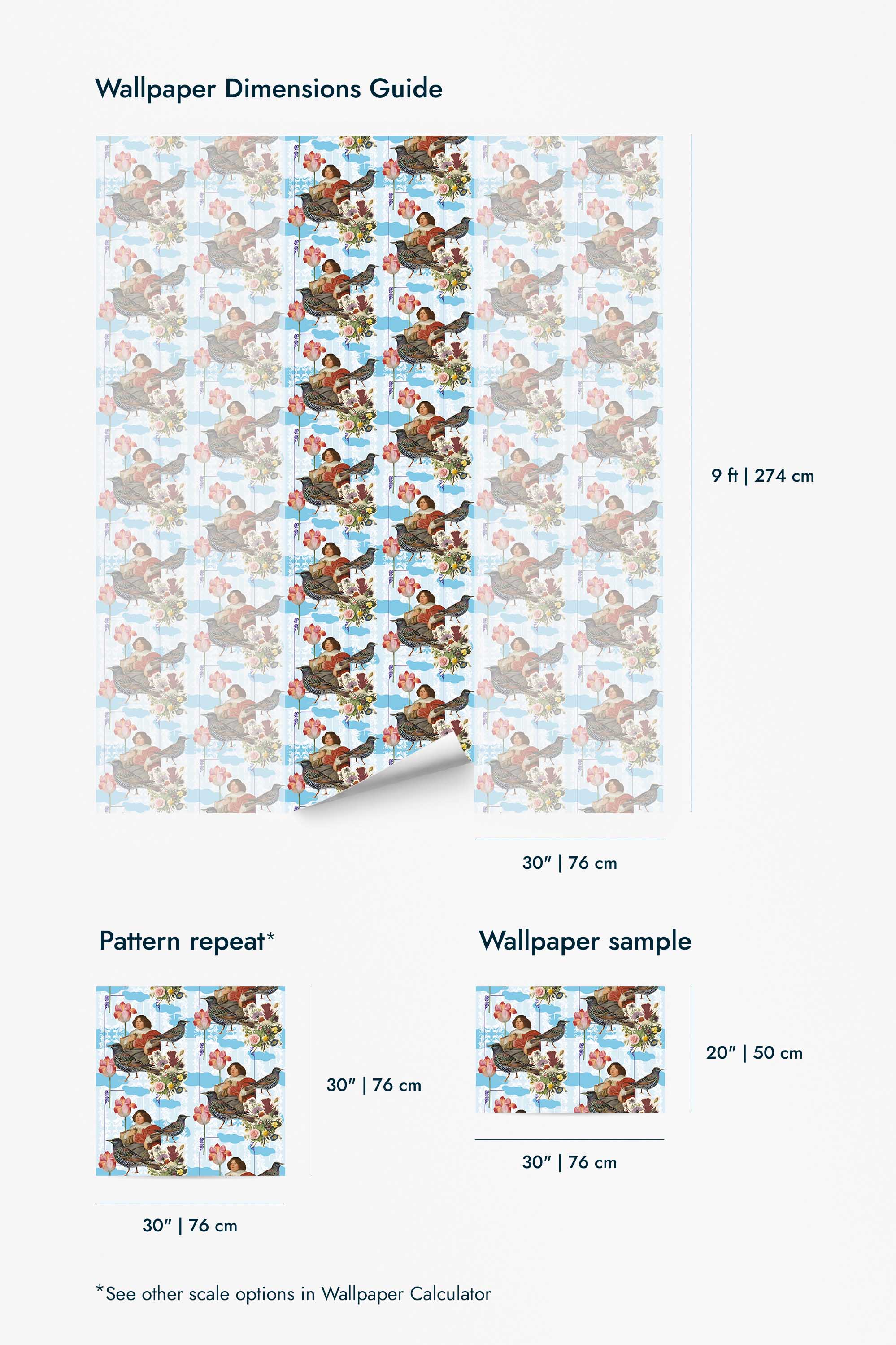 Each repeat reveals new details—delicate feathers, blooming petals, and textures that echo aged frescoes. The cloud-like blue backdrop softens the composition, allowing each element to breathe. Because of this balance, the wallpaper works beautifully in salons, reading corners, bedrooms, or creative studios. Whether used as an accent or a full-room installation, it brings calm, culture, and character into the space.