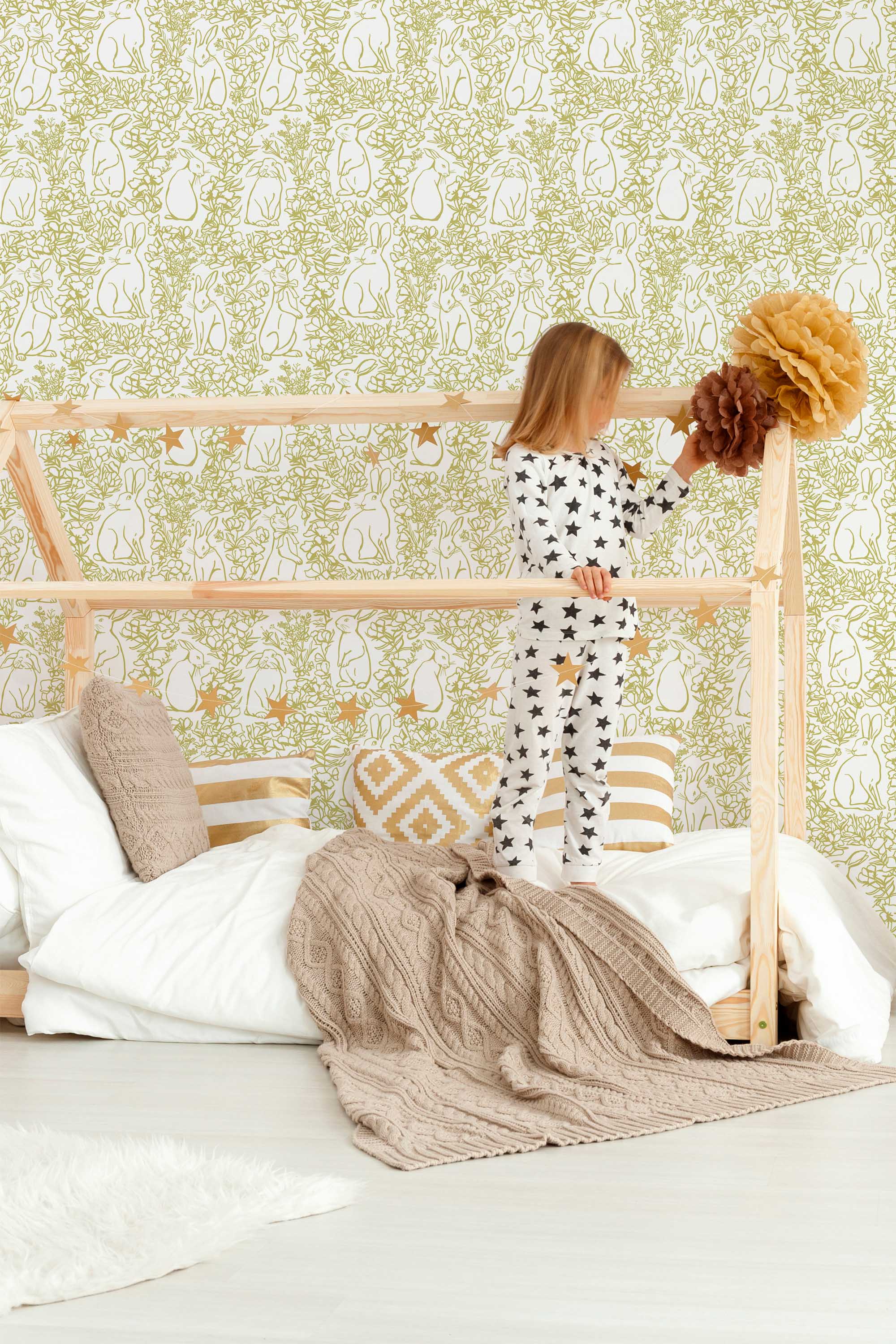Whimsical Rabbit Wallpaper brings gentle woodland charm to kids’ rooms with soft olive green outlines of rabbits and nature-inspired shapes on a light background. The playful pattern feels calm yet imaginative, while the minimal line work keeps the space airy and balanced. Moreover, the organic layout creates a soothing atmosphere that works beautifully in nurseries and cozy family spaces.