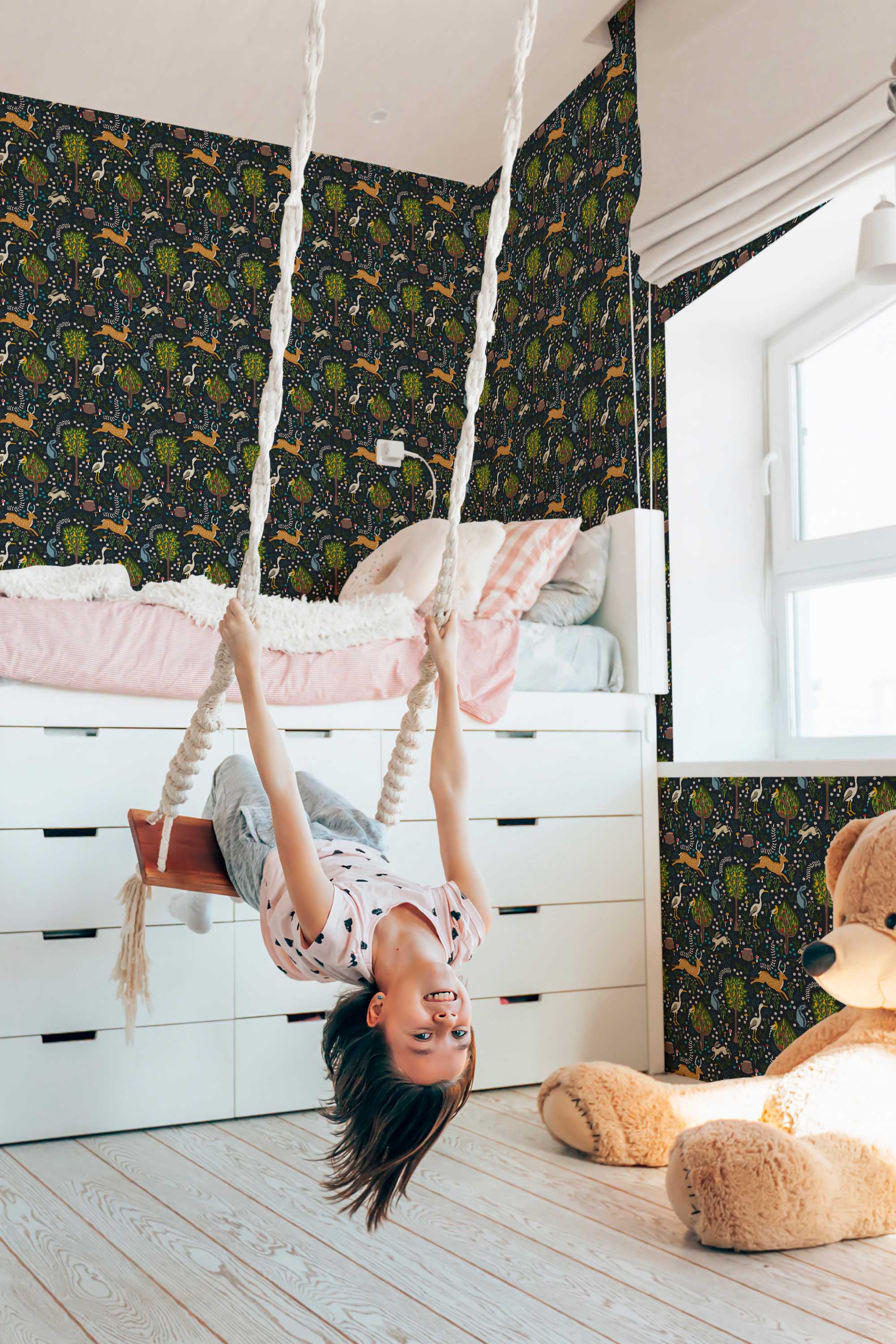 Whimsical Woodland wallpaper brings eclectic charm to a living room or bedroom with deep blue tones and richly detailed forest animals. The immersive woodland pattern surrounds trees and foliage with intricate nature elements, creating a bold yet enchanting atmosphere. The Whimsical Woodland peel and stick wallpaper offers a removable and self-adhesive option for easy updates, and it is also available as non-pasted for traditional paste-the-wall installation. Whimsical Woodland transforms any space into a dramatic forest retreat filled with texture and depth. Printed on eco-friendly, PVC-free materials using GreenGuard Certified inks, this wallpaper is safe for indoor use and ideal for renters or long-term decorating.