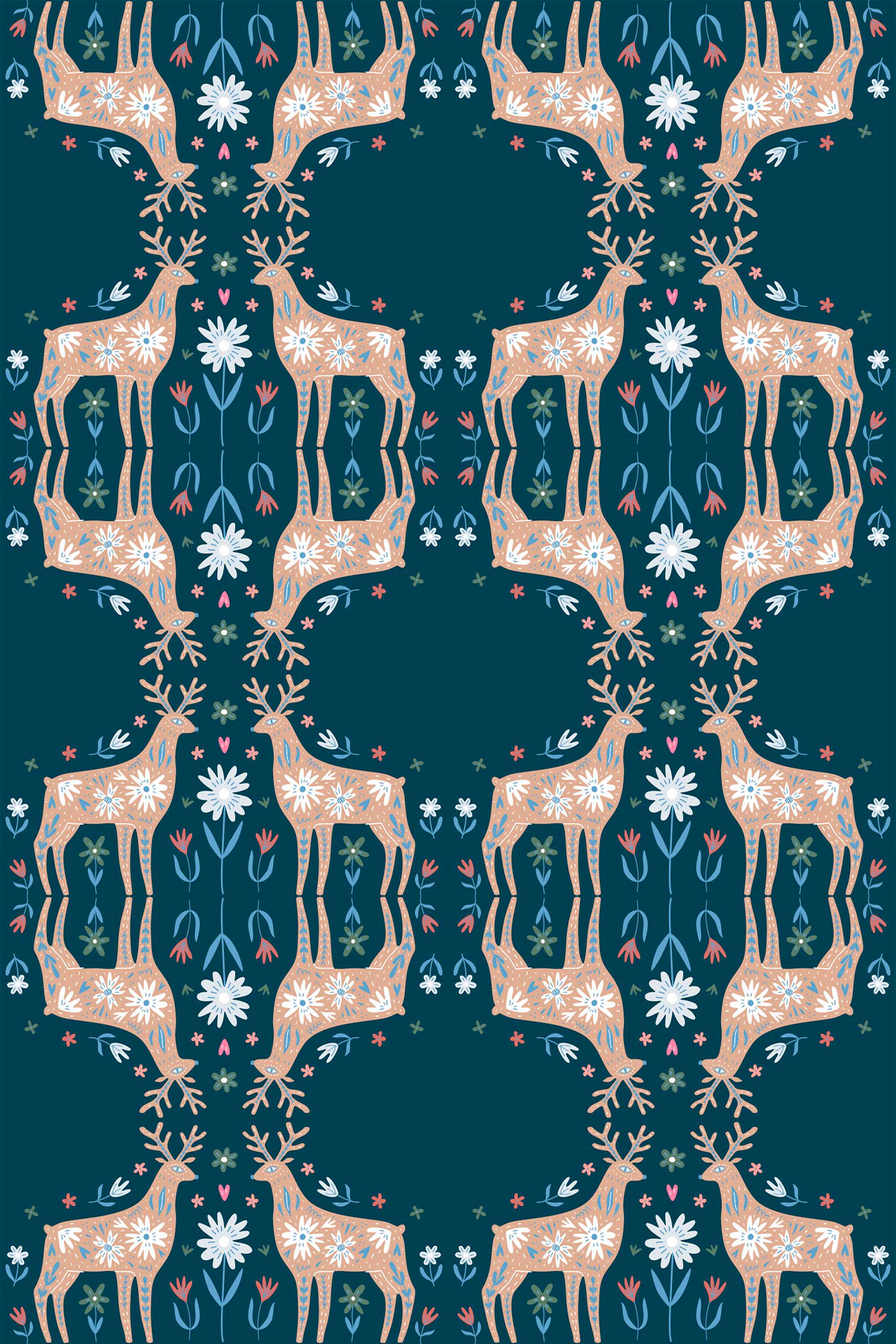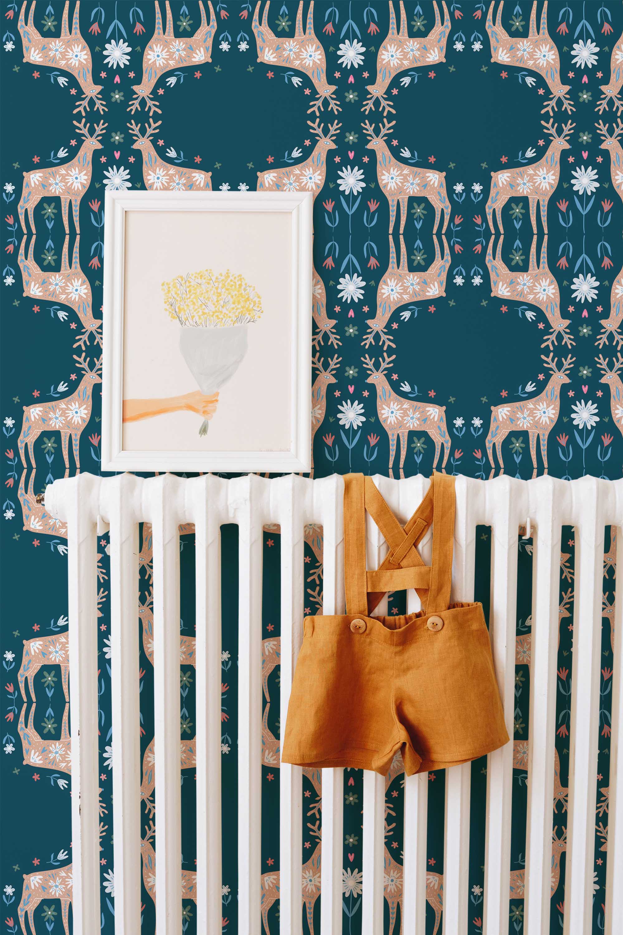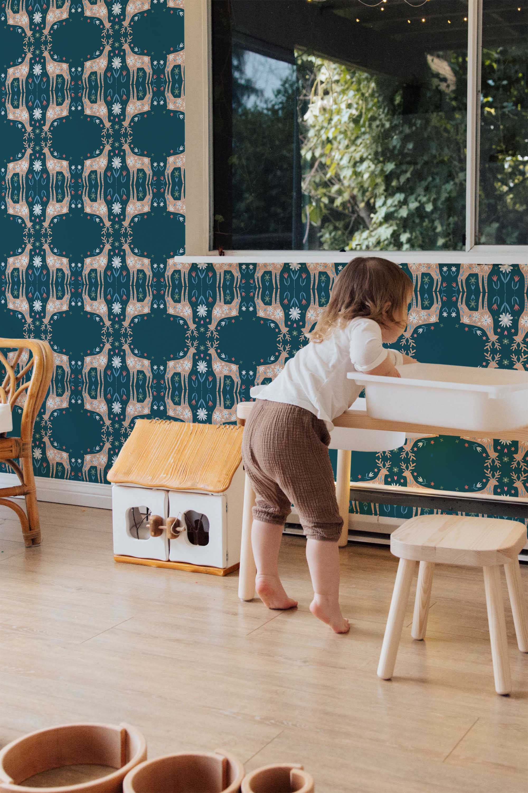 Woodland Deer wallpaper brings novelty charm to a living room or bedroom with deep teal tones and intricate ornamental deer motifs. The rich forest pattern creates a decorative and slightly dark atmosphere that feels both elegant and bold. The Woodland Deer peel and stick wallpaper offers a removable and self-adhesive option for easy decorating, and it is also available as non-pasted for traditional paste-the-wall installation. Woodland Deer combines ornate animal details with a dramatic teal backdrop to create a striking forest theme. Printed on eco-friendly, PVC-free materials using GreenGuard Certified inks, this wallpaper is safe for indoor use and ideal for renters or long-term decorating.